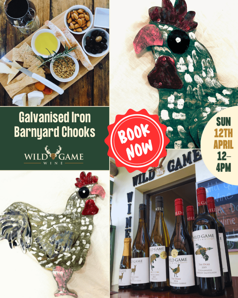 Our FIRST Wine & Art Workshop for the year is making your very own ‘Barnyard Chook’ wallhanging out of corrugated galvanised iron and rivets.